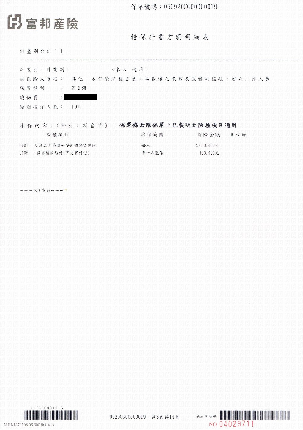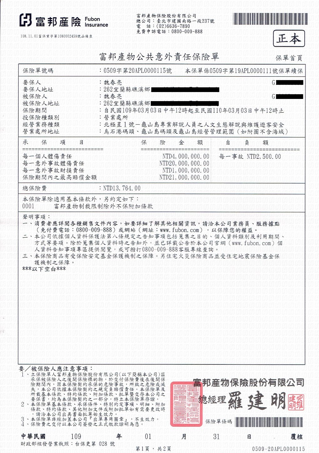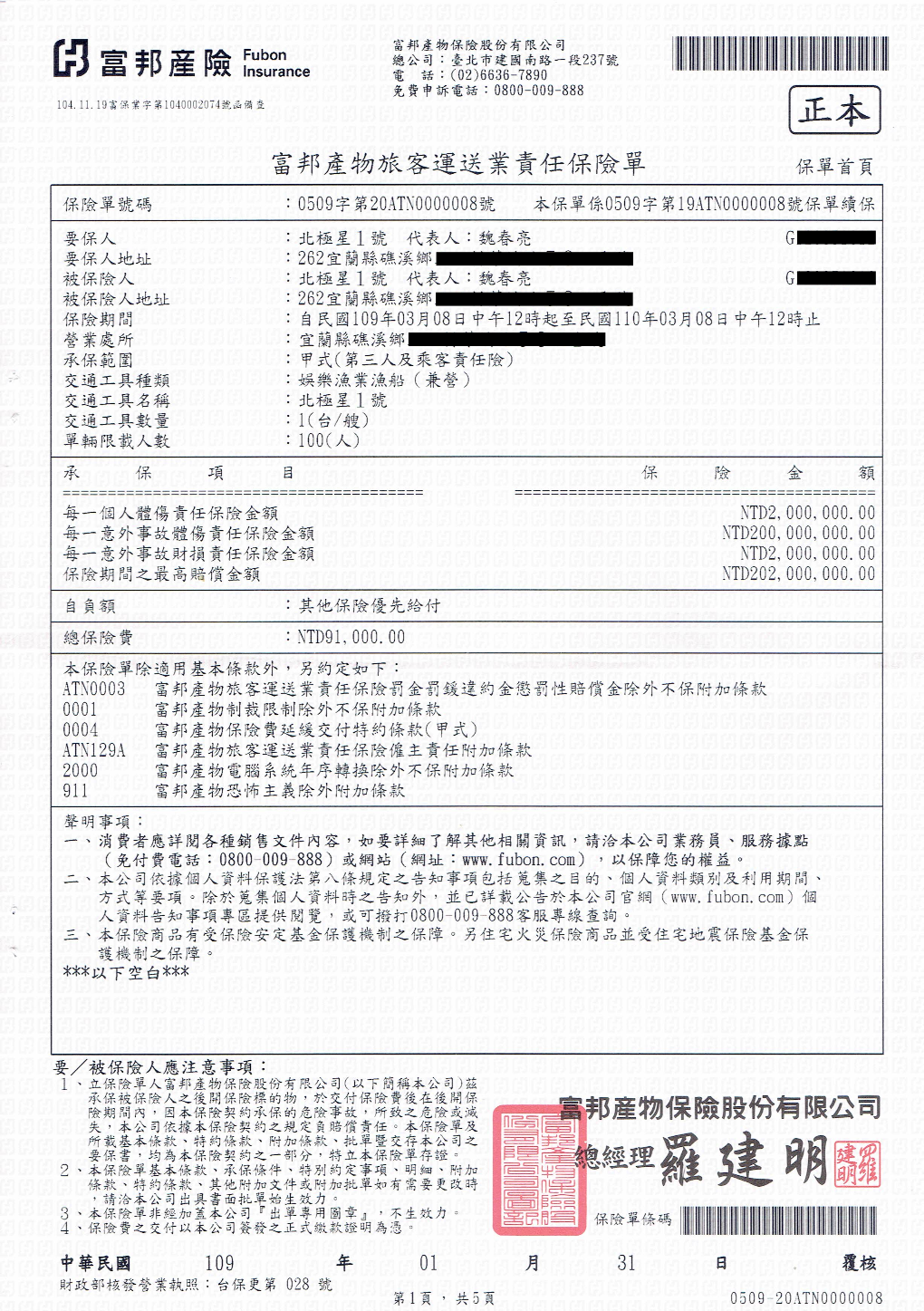 標題:【公開透明 你我放心】2020北極星壹號保險單 執照